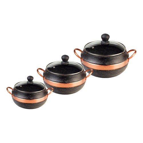JOGO COM 3 PANELAS DE PEDRA SABÃO COM TAMPA DE VIDRO
