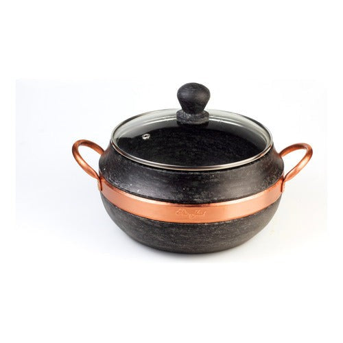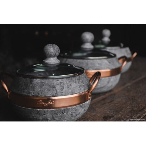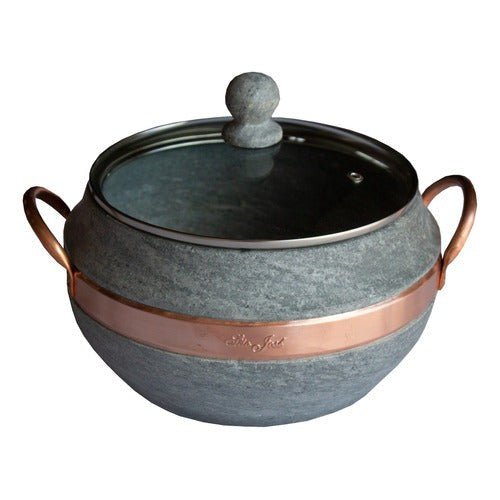01 - Panela de pedra sabão com alça e contorno em cobre capacidade 3,600 litros