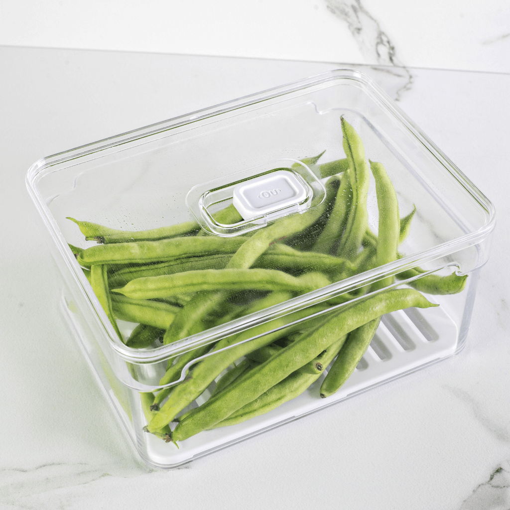 - A bandeja interna evita que os alimentos fiquem molhados após a lavagem, ajudando a prevenir e conservar