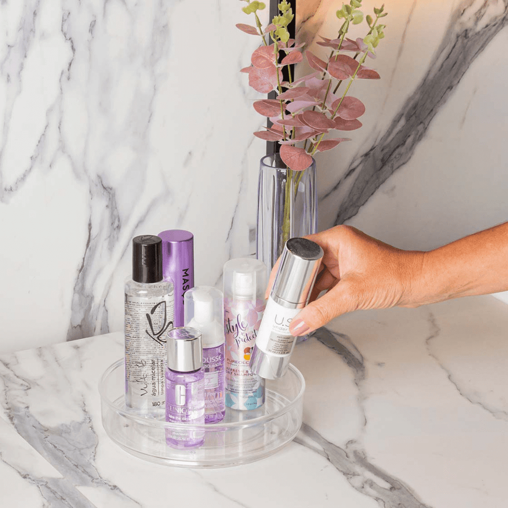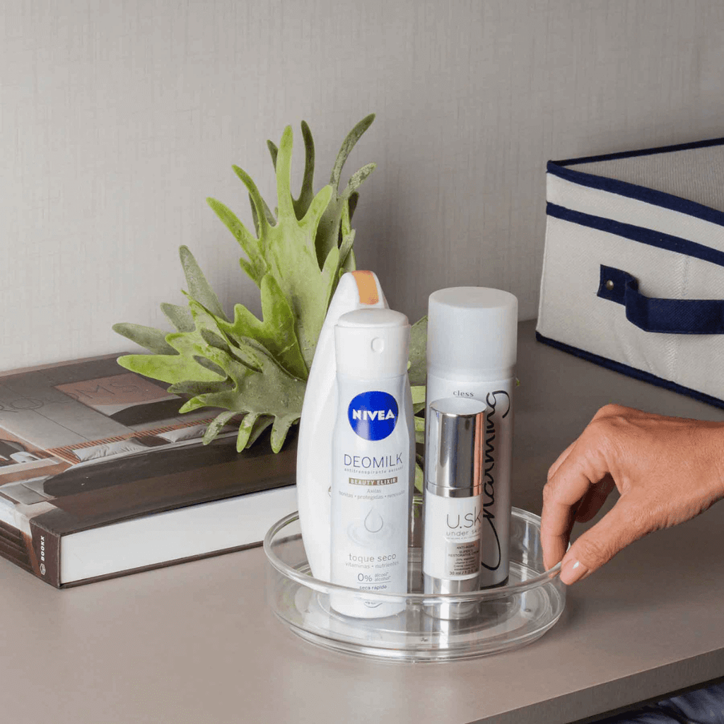- Feito de plástico resistente e durável, possui um design contemporâneo e uma base giratória que facilita o acesso a todos os seus produtos.