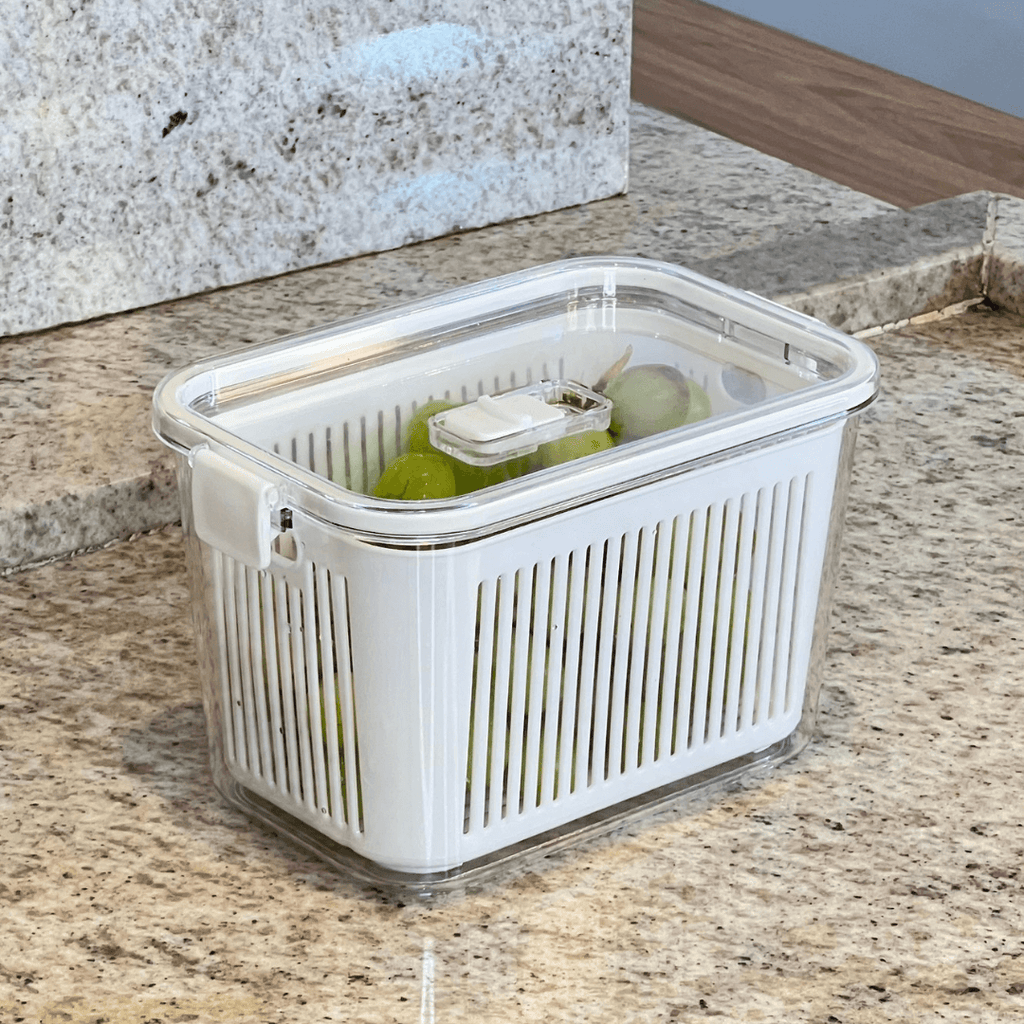 - Possui trava na tampa e um cesto de drenagem para evitar que os alimentos entrem em contato com a água,