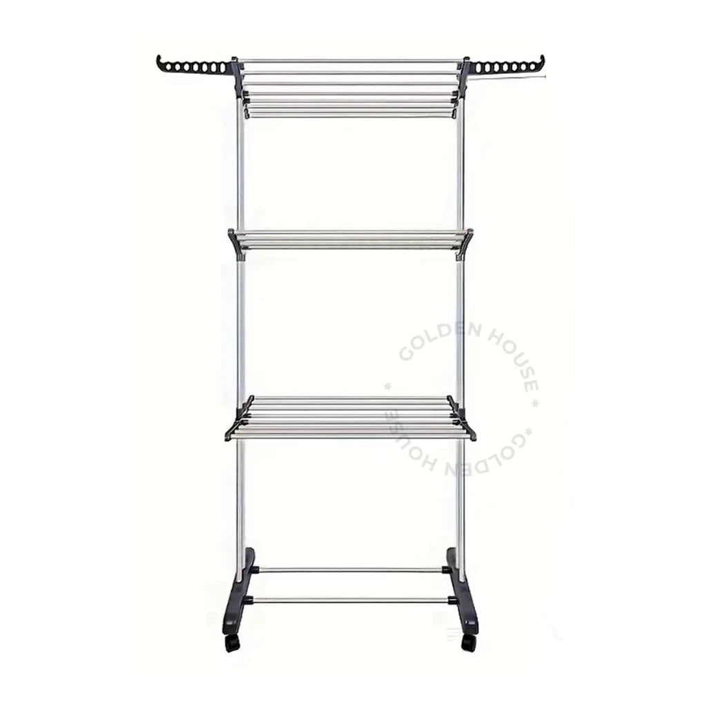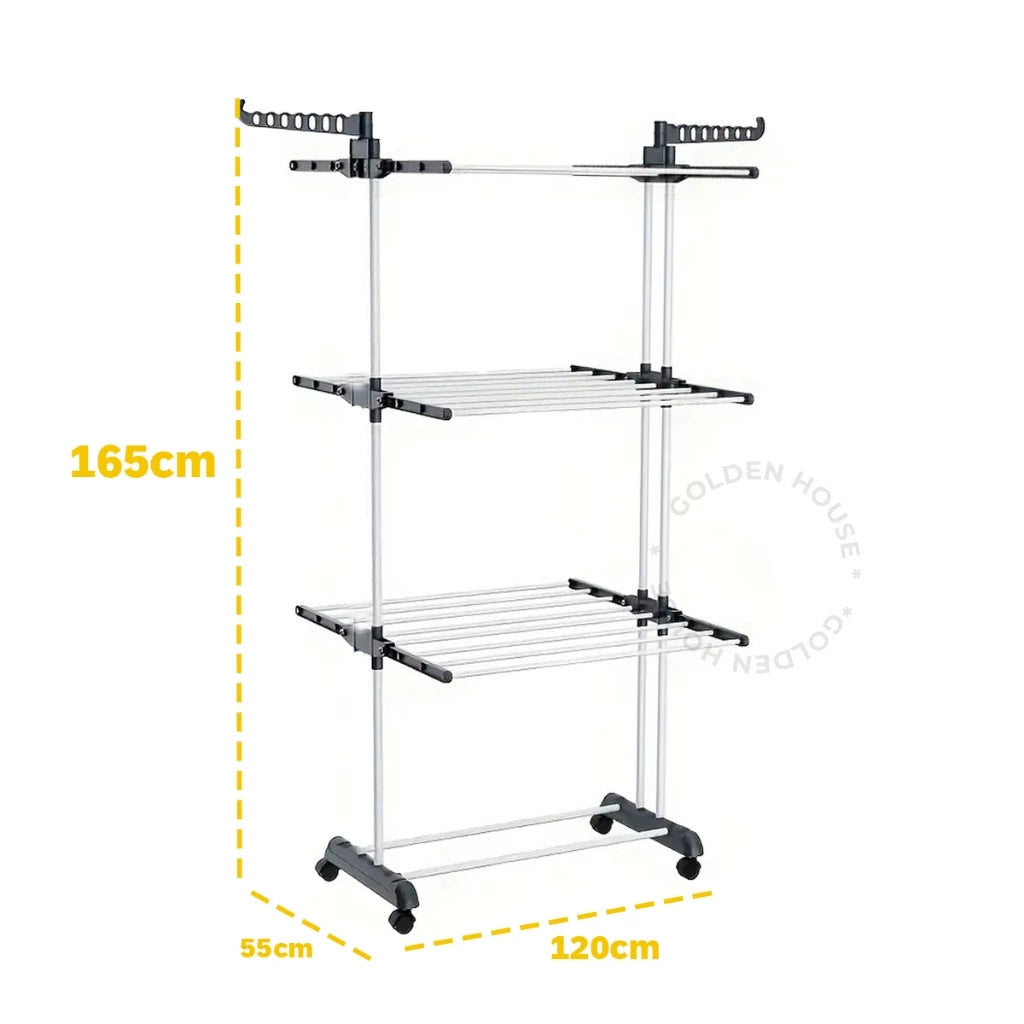 Deixe suas roupas secarem com praticidade e estilo com o Varal de Chão Dobrável 3 Andares com Rodinhas.